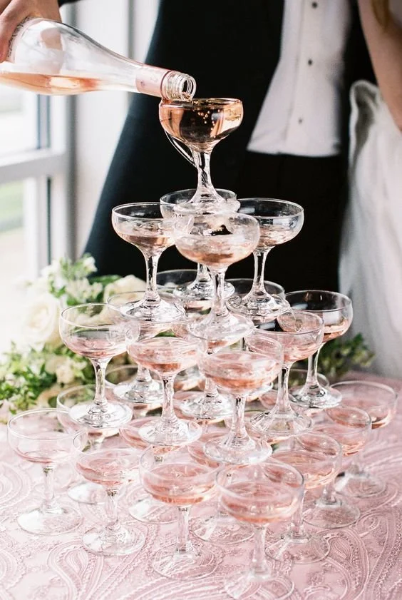Flat rate of $350 for the tower plus number of bottles of champagne used for your tower. (Budget for around $40/bottle plus 25 bottles for 100 guests, give or take). Includes coup glasses.